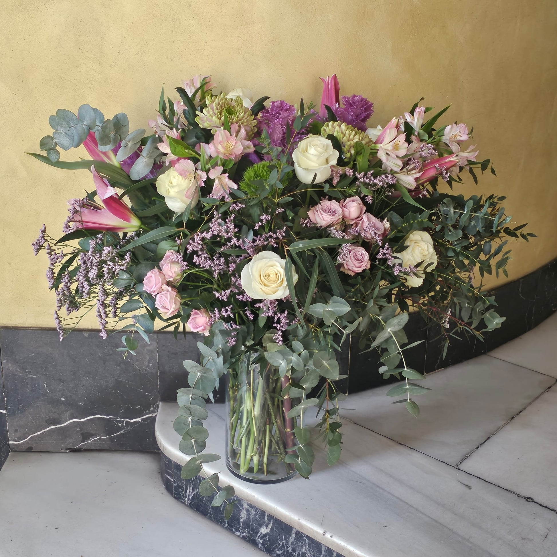 Jarrón con rosas de color blanco y rosa, lilium y eucalipto.
