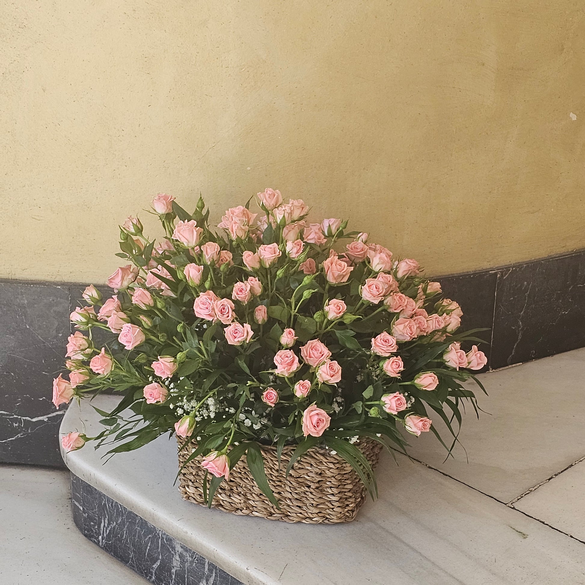 Cesta de mimbre con rosas pitimini de color rosa (el color de las rosas se puede cambiar).