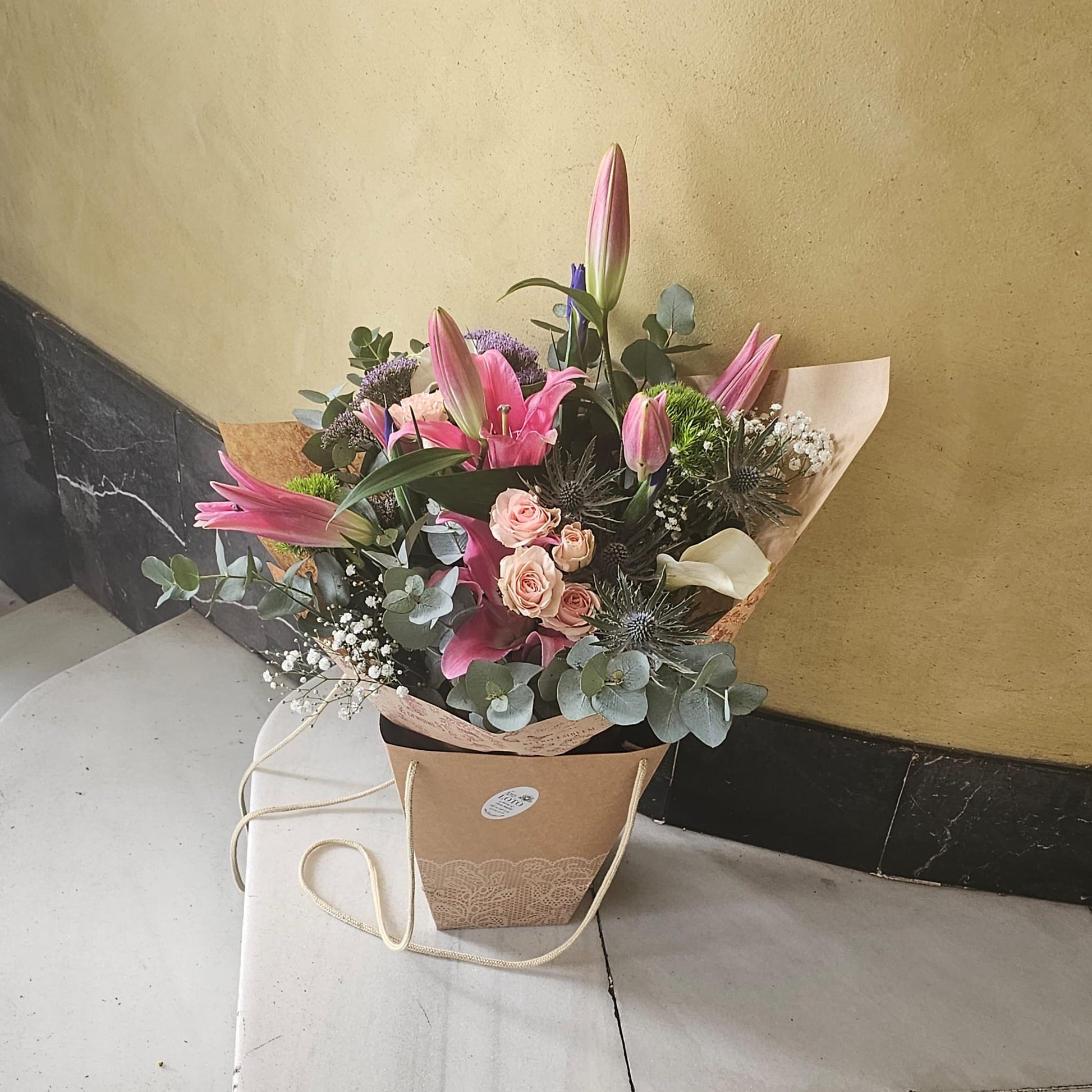 Bolsa de papel Craft con lilium, rosas, limonium y eucalipto.
